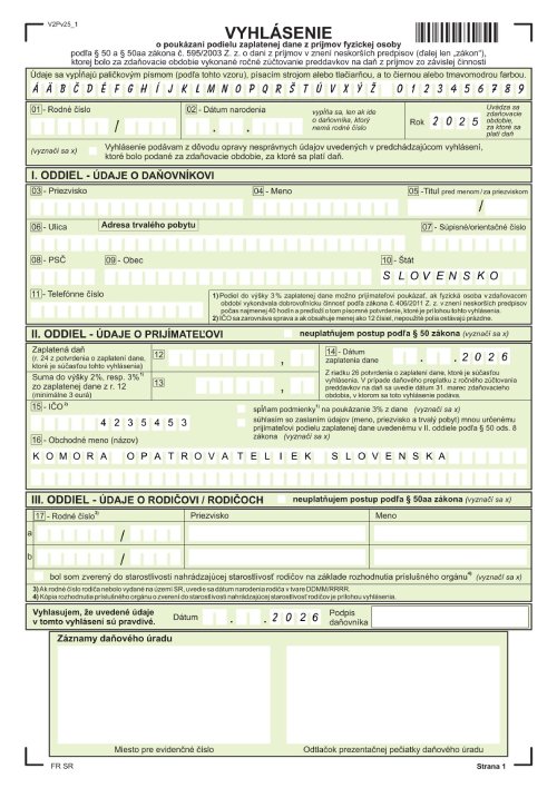 Na vyhlásení je dôležité vypísať všetky údaje správne a úplne a sumu 2% po vypočítaní zaokrúhliť matematicky.