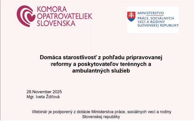 1. Jan 2026 Záznam- Webinár: Domáca starostlivosť z pohľadu novej reformy a poskytovateľov terénnych a ambulantných služieb Dátum: 28.11.2025 Zaujímajú Vás informácie z prvej ruky o integrovanej posudkovej činnosti a nových…